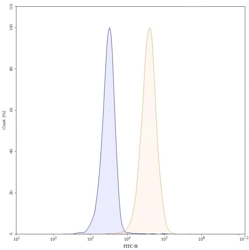 Flow-cytometry using anti-human CD31 antibody. Jurkat cells were stained with an irrelevant antibody (Blue Histogram) or an anti-human CD31 monoclonal antibody (Catalog No.:TD-HB004033, Yellow Histogram) at a concentration of 5 µg/ml for 30 mins at RT. After washing, bound antibody was detected using a Goat Anti-Mouse IgG H&L Polyclonal Antibody, FITC (Catalog No.:TD-MF690414) and cells analysed on a NovoCyte Flow Cytometer. | Flow-cytometry using anti-human CD31 antibody. THP-1 cells were stained with an irrelevant antibody (Green Histogram) or an anti-human CD31 antibody monoclonal antibody (Catalog No.:TD-HB004033 , Blue Histogram) at a concentration of 5 µg/ml for 30 mins at RT. After washing, bound antibody was detected using a FITC conjugated goat anti-mouse antibody (Catalog No.:TD-MF690414) and cells analysed on a NovoCyte Flow Cytometer. | SDS-PAGE for Anti-Human CD31/PECAM1 Antibody (SAA2179)