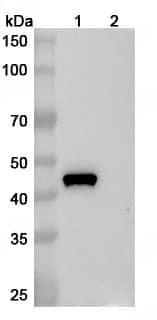SDS-PAGE for Anti-Gal d 2 Human IgE Antibody (11B6) | Western blot analysis was performed using anti-/ monoclonal antibody at 1ug/mL on various samples.Lane 1:recombinant Gallus gallus Gal d 2/OVA/Ovalbumin(Catalog No.:TD-GP552012)Lane 2:negative control