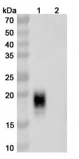 Detects recombinant cat Fel d 1 (Catalog No.:TD-FC088011) in indirect ELISA | Western blot analysis was performed using anti-/ monoclonal antibody at 1ug/mL on various samples.Lane 1:recombinant Cat Fel d 1(Catalog No.:TD-FC088011)Lane 2:negative control