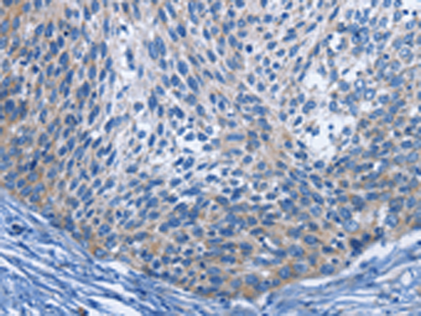 Immunohistochemistry analysis of paraffin-embedded Human cervical cancer using IL-2 Receptor beta antibody. High-pressure and temperature Sodium Citrate pH 6.0 was used for antigen retrieval.
