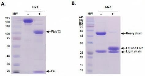 IdeS Protease is an immunoglobulin-degrading enzyme from Streptococcus pyogenes (IdeS). It cleaves Immunoglobulin G (IgG) with high specificity at a single site below the hinge region, yielding F(ab’)2 and Fc fragments. |