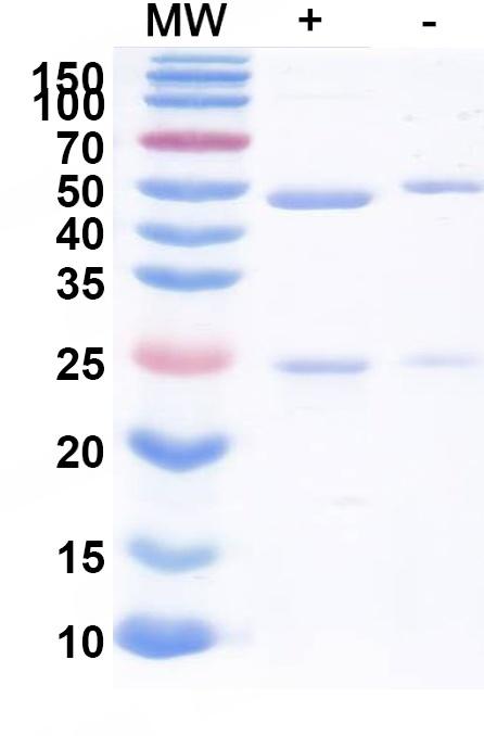 SDS-PAGE for Endo S2/Endo-beta-N-acetylglucosaminidase | Human IgG1 was incubated with (+) or without (-) Endo S2 and analyzed by reducing SDS–PAGE. A reduced molecular weight of the heavy chain was observed in the Endo S2–treated group.