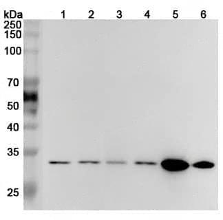 Western blot analysis was performed using anti-VDAC1 polyclonal antibody at 1µg/ml on various samples.Lane 1:HepG2 cell lysateLane 2:Hela cell lysateLane 3:Mouse brain lysateLane 4:Rat brain lysateLane 5:Mouse heart lysateLane 6:Rat heart lysate