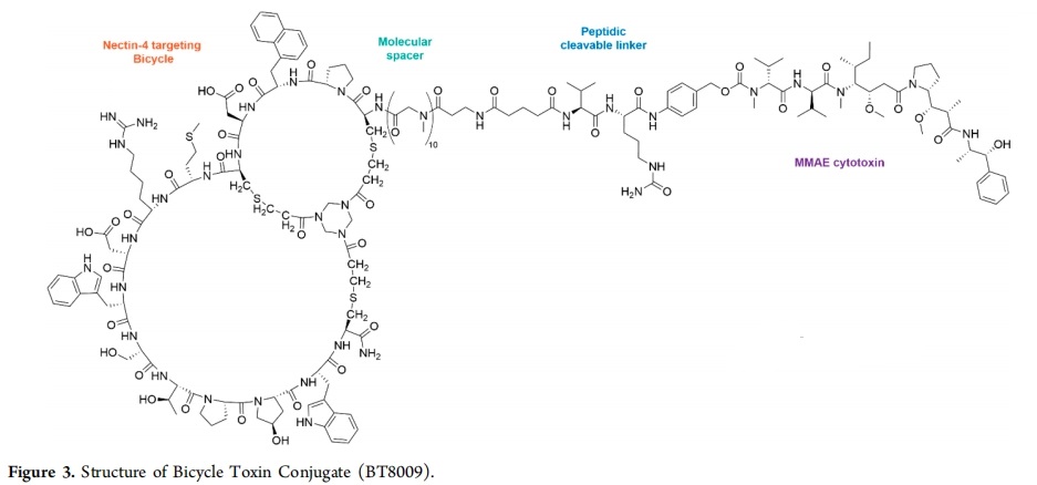 经过全面优化的双环肽被整合到毒素偶联物BT8009中,该复合物保留了母体双环肽的亲和力,并在CDX小鼠模型中表现出强大的抗肿瘤活性,并且在有效剂量下耐受性良好。BT8009于2018年被选为候选药物,目前正在进行临床评估。