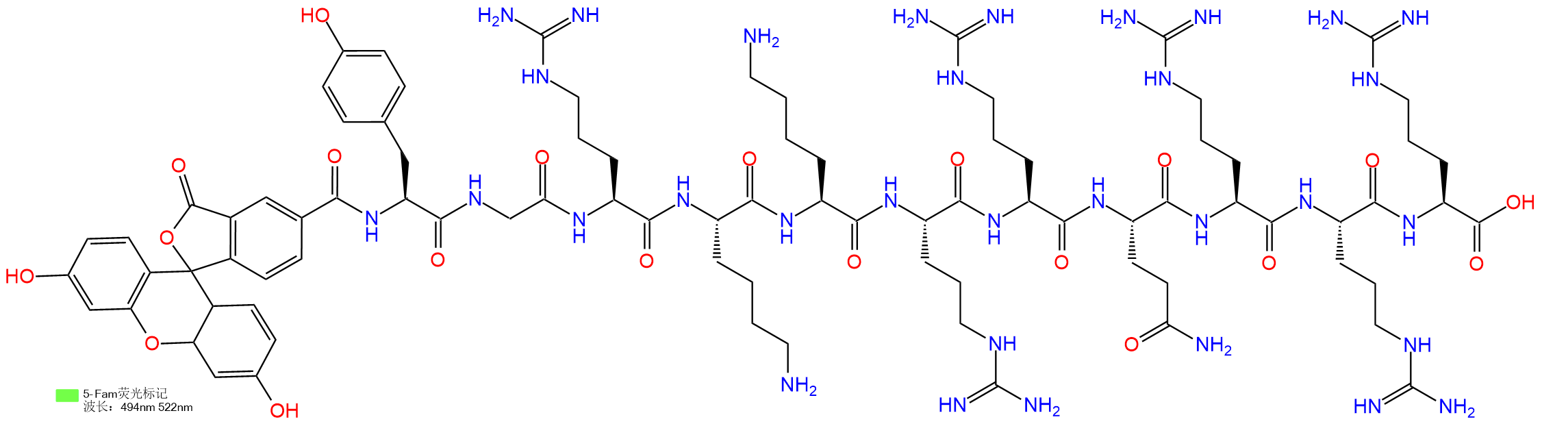HIV-TAT (47-57), FAM - labeled是荧光(FAM)标记的TAT肽,Abs/Em=494/521nm。TAT是HIV反式激活蛋白(TAT)最具特征的片段。富含精氨酸的TAT肽直接穿透质膜,而不是通过内吞作用。