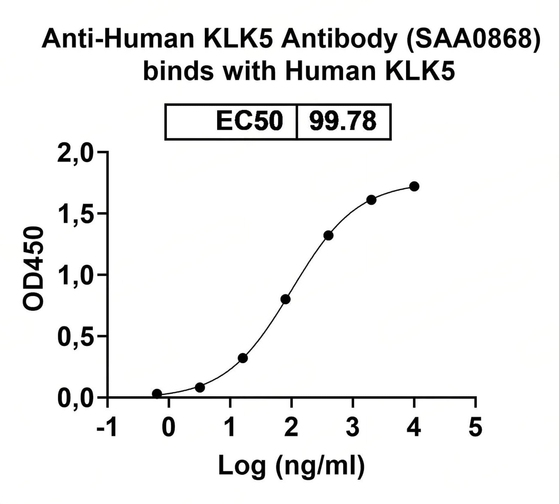 Detects Human KLK5 in indirect ELISAs. | SDS-PAGE for Anti-Human KLK5 Antibody (SAA0868). | Western blot analysis was performed using anti-KLK5 monoclonal antibody at 1ug/mL on various samples.Lane 1:recombinant human KLK5 (Catalog No.:TD-HP212012)Lane 2:negative control