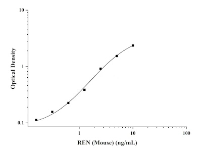 本试产品采用双抗体夹心ELISA法。用抗Mouse REN抗体包被于酶标板上,实验时样品(或标准品)中的Mouse REN会与包被抗体结合。后依次加入生物素化的抗Mouse REN抗体和HRP酶标记的亲和素,抗Mouse REN抗体与结合在包被抗体上的Mouse REN结合,生物素与亲和素特异性结合而形成免疫复合物,游离的成分被洗去。加入显色底物(TMB),TMB在HRP酶的催化下呈现蓝色,加终止液后变成黄色。用酶标仪在450 nm波长处测OD值,Mouse REN浓度与OD450 OD值之间呈正比,通过绘制标准曲线计算出样品中Mouse REN的浓度。