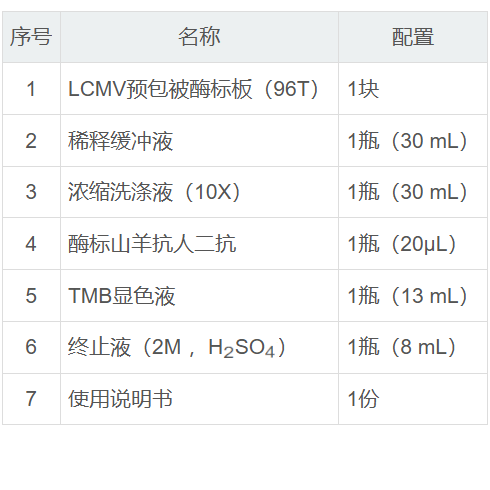 此LCMV试剂盒,采用间接法酶联免疫吸附试验。依次往预包被LCMV抗原的酶标板微孔中加入样本、HRP标记二抗,经过孵育并彻底洗涤。用底物TMB显色后终止液终止反应。再用酶标仪在波长450nm(参比波长630nm)处测定吸光度(OD值),从而判定检测样品中抗LCMV抗体(LCMV-IgG-Ab)的存在与否。