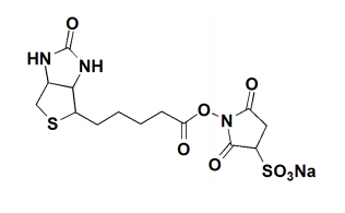 Sulfo-NHS-Biotin (Sulfosuccinimidyl biotin)is a water soluble biotinylation reagent. It is amine reactive and has a spacerarm length of 13.5Å. The Sulfo-NHS-Biotin biotinylation reagent is ideal forbiotinylating antibody or protein that can then be used for protein detectionor immobilization. Sulfo-NHS-Biotin is particularly useful for targeting cellsurface proteins.