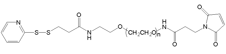Ortho-pyridyl disulfide (OPSS) functionalized polyethylene glycol (OPSS PEG) is a thiol (-SH) group reactive PEG derivative that can be used to modify biomolecules or other materials via their available thiol groups. Ortho-pyridyl disulfide reacts with thiol group to form a stable disulfide bond while a thiol pyridyl group is released.