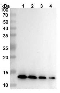 Reconstitute in sterile water for a stock solution. Adjust the volume of sterile water so that, after reconstitution, the final stock concentration matches the value indicated on the product label or datasheet. RECONSTITUTION PROTOCOL 1. Allow the product to be reconstituted and the reconstitution diluent to reach room temperature. 2. Tap or briefly centrifuge the product vial before opening to dislodge any lyophilized material that may be dispersed on the wall or cap of the vial. 3. Use the diluent and stock concentration recommended in the product datasheet. If preparing a stock concentration higher than recommended, contact Technical Service. 4. After adding the diluent, re-cap the vial and invert gently by hand or place on a slow rocking platform to allow the reconstitution diluent to coat all the surfaces inside the vial.Note: Do not mix by vortexing or by pipetting the material up and down. 5. Allow the vial to sit at room temperature with gentle agitation for at least 15 minutes before aliquotting or using. 6. Store the reconstituted material in single use aliquots in polypropylene or siliconized tubes. Aliquots of 10 μL or larger are recommended.