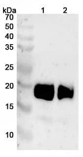 Reconstitute in sterile water for a stock solution. Adjust the volume of sterile water so that, after reconstitution, the final stock concentration matches the value indicated on the product label or datasheet. RECONSTITUTION PROTOCOL 1. Allow the product to be reconstituted and the reconstitution diluent to reach room temperature. 2. Tap or briefly centrifuge the product vial before opening to dislodge any lyophilized material that may be dispersed on the wall or cap of the vial. 3. Use the diluent and stock concentration recommended in the product datasheet. If preparing a stock concentration higher than recommended, contact Technical Service. 4. After adding the diluent, re-cap the vial and invert gently by hand or place on a slow rocking platform to allow the reconstitution diluent to coat all the surfaces inside the vial.Note: Do not mix by vortexing or by pipetting the material up and down. 5. Allow the vial to sit at room temperature with gentle agitation for at least 15 minutes before aliquotting or using. 6. Store the reconstituted material in single use aliquots in polypropylene or siliconized tubes. Aliquots of 10 μL or larger are recommended.