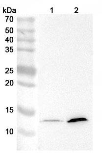 Western blot analysis was performed using anti-H4K5acK8ac monoclonal antibody at 1ug/mL on various samples. Lane 1: 293T cell lysate Lane 2: HCT116 cell lysate