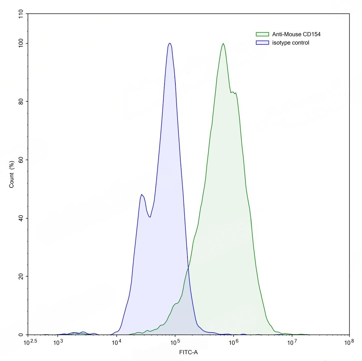 Flow-cytometry using anti-mouse CD154 antibody.CD154 Transfected CHO cells were stained with an irrelevant antibody (Blue Histogram) or an anti-mouse CD154 antibody monoclonal antibody (Catalog # TD-MB199107 ,Green Histogram) at a concentration of 5 µg/ml for 30 mins at RT. After washing, bound antibody was detected using a FITC conjugated goat anti-rat antibody and cells analysed on a NovoCyte Flow Cytometer.