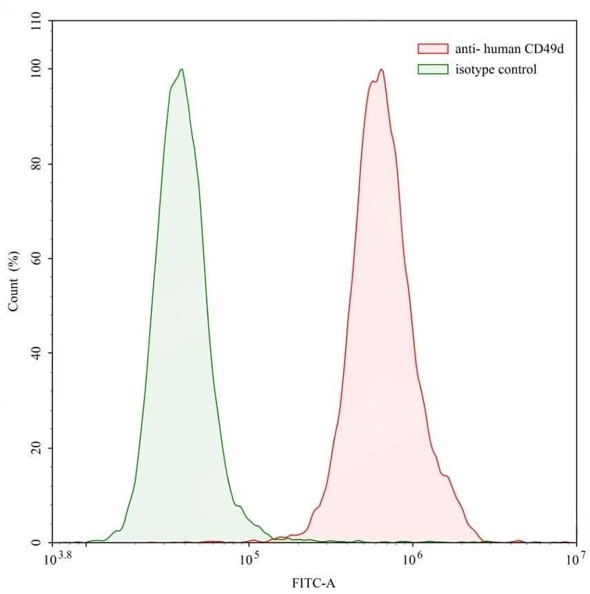 Flow-cytometry using anti-human CD49d antibody. Human Jurkat cell line were stained with an irrelevant antibody (Green Histogram) or an anti-human CD49d antibody monoclonal antibody (Catalog No.:TD-HY596107 , Red Histogram) at a concentration of 20 µg/ml for 30 mins at RT. After washing, bound antibody was detected using a FITC conjugated goat anti-rabbit antibody (Catalog No.:TD-PTB96441) and cells analysed on a NovoCyte Flow Cytometer.