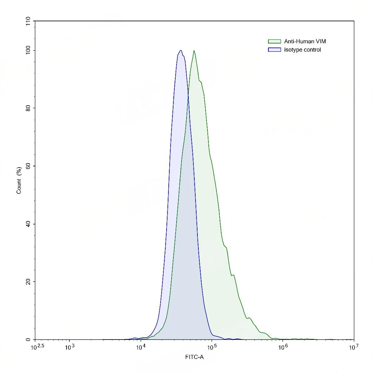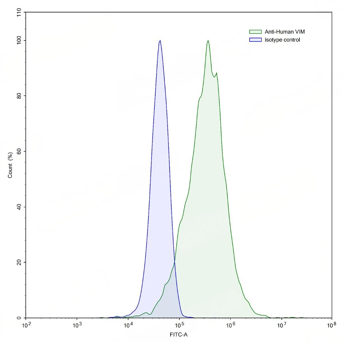 Flow-cytometry using anti-human VIM antibody.PC-3 cells were stained with an irrelevant antibody (Blue Histogram) or an anti-human VIM antibody monoclonal antibody (Catalog # TD-HY550107 ,Green Histogram) at a concentration of 5 µg/ml for 30 mins at RT. After washing, bound antibody was detected using a FITC conjugated goat anti-human antibody (Catalog # TD-HF690414) and cells analysed on a NovoCyte Flow Cytometer.