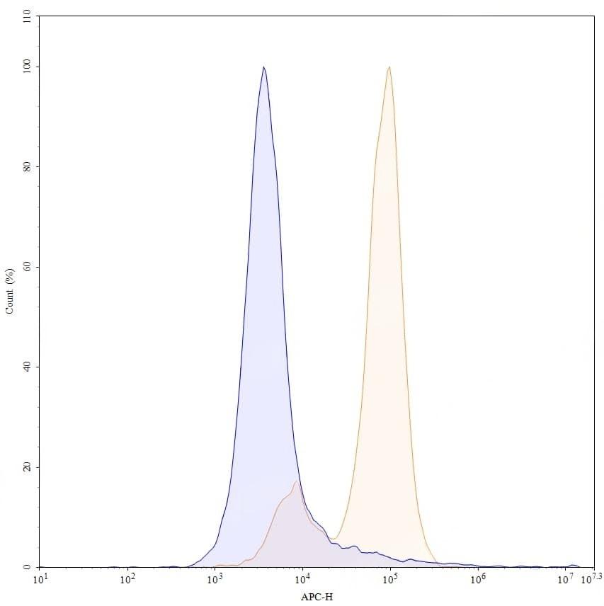 Flow-cytometry using APC anti-human CD66e antibody. HPAC cells were stained with an irrelevant antibody (Blue Histogram) or an APC anti-human CD66e monoclonal antibody (Catalog No.:TD-HY546237, Yellow Histogram) at a concentration of 5 µg/ml for 30 mins at RT. After washing, and cells analysed on a NovoCyte Flow Cytometer.