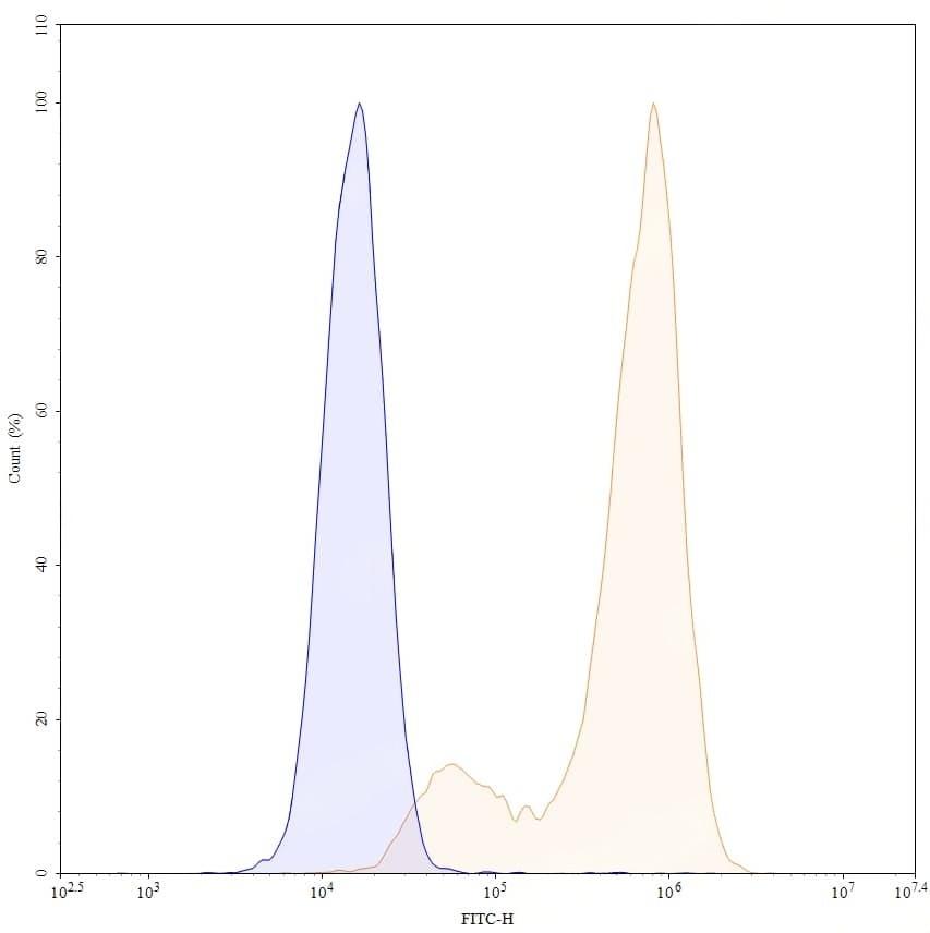 Flow-cytometry using FITC anti-human CD66e antibody. HPAC cells were stained with an irrelevant antibody (Blue Histogram) or an FITC anti-human CD66e monoclonal antibody (Catalog No.:TD-HY546217, Yellow Histogram) at a concentration of 5 µg/ml for 30 mins at RT. After washing, and cells analysed on a NovoCyte Flow Cytometer.