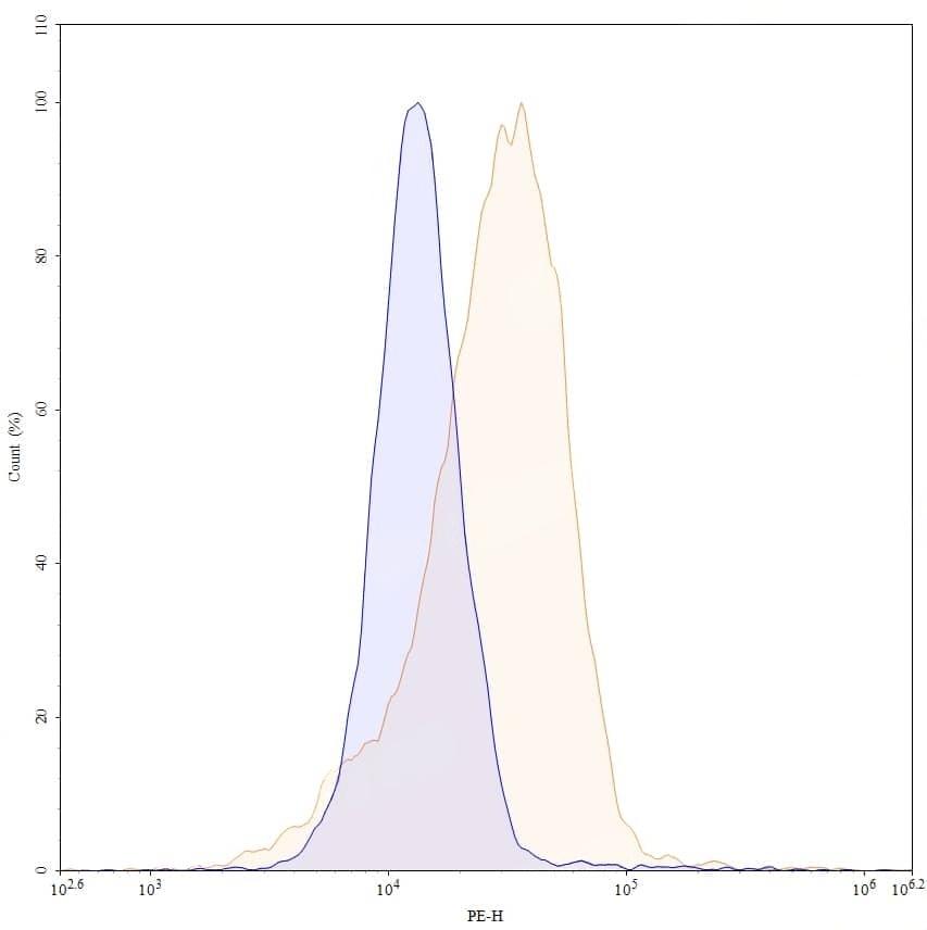 Flow-cytometry using PE anti-human CD324 antibody. HT-29 cells were stained with an irrelevant antibody (Blue Histogram) or an PE anti-human CD324 monoclonal antibody (Catalog No.:TD-HY460227, Yellow Histogram) at a concentration of 5 µg/ml for 30 mins at RT. After washing, cells analysed on a NovoCyte Flow Cytometer.