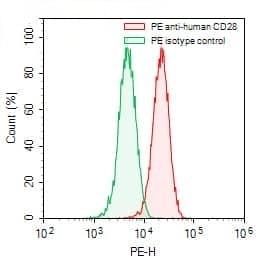 Flow-cytometry using PE anti-human CD28 antibody. RPMI-8226 cells were stained with an irrelevant antibody (Green Histogram) or a PE anti-human CD28 antibody monoclonal antibody (Catalog No.:TD-HY422227, Red Histogram) at a concentration of 5 µg/ml for 30 mins at RT. After washing, cells analysed on a NovoCyte Flow Cytometer.