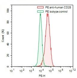 Flow-cytometry using PE anti-human CD28 antibody. RPMI-8226 cells were stained with an irrelevant antibody (Green Histogram) or a PE anti-human CD28 antibody monoclonal antibody (Catalog # TD-HY422127, Red Histogram) at a concentration of 5 µg/ml for 30 mins at RT. After washing, cells analysed on a NovoCyte Flow Cytometer.