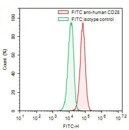 Flow-cytometry using FITC anti-human CD28 antibody. RPMI-8226 cells were stained with an irrelevant antibody (Green Histogram) or a FITC anti-human CD28 antibody monoclonal antibody (Catalog # TD-HY422117, Red Histogram) at a concentration of 5 µg/ml for 30 mins at RT. After washing, cells analysed on a NovoCyte Flow Cytometer.