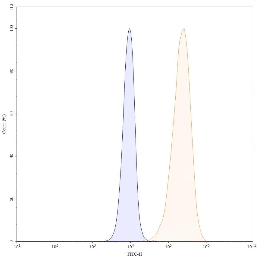 Flow-cytometry using APC anti-human CD98 antibody. Hela cells were stained with an irrelevant antibody (Blue Histogram) or an APC anti-human CD98 monoclonal antibody (Catalog No.:TD-HY415117, Yellow Histogram) at a concentration of 5 µg/ml for 30 mins at RT. After washing, cells analysed on a NovoCyte Flow Cytometer.