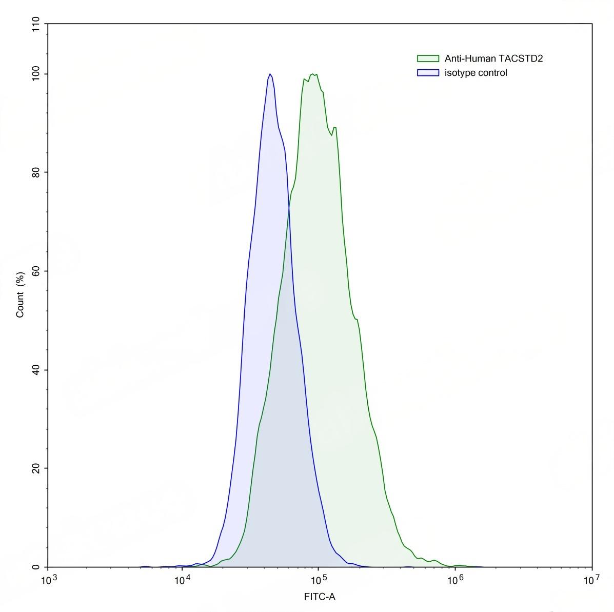 Flow-cytometry using anti-human TACSTD2 antibody.PC-3 cells were stained with an irrelevant antibody (Blue Histogram) or an anti-human TACSTD2 antibody monoclonal antibody (Catalog # TD-HY373107 ,Green Histogram) at a concentration of 5 µg/ml for 30 mins at RT. After washing, bound antibody was detected using a FITC conjugated goat anti-mouse antibody (Catalog # TD-MF690414) and cells analysed on a NovoCyte Flow Cytometer.