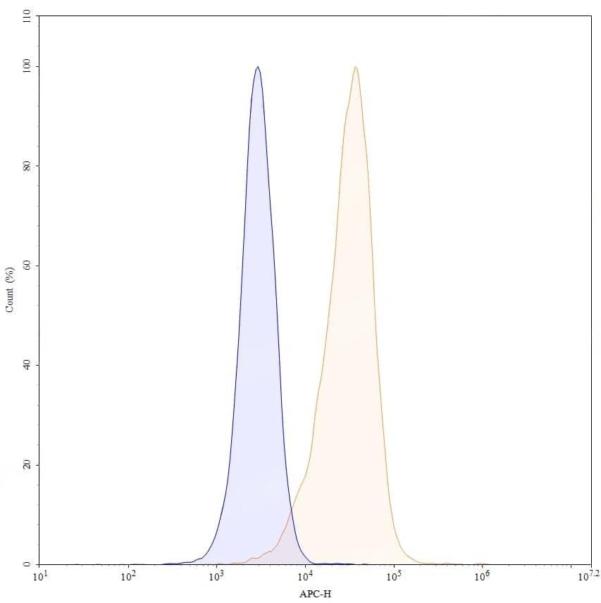 Flow-cytometry using APC anti-human CD64 antibody. THP-1 cells were stained with an irrelevant antibody (Blue Histogram) or an APC anti-human CD64 monoclonal antibody (Catalog No.:TD-HY372137, Yellow Histogram) at a concentration of 5 µg/ml for 30 mins at RT. After washing, cells analysed on a NovoCyte Flow Cytometer.