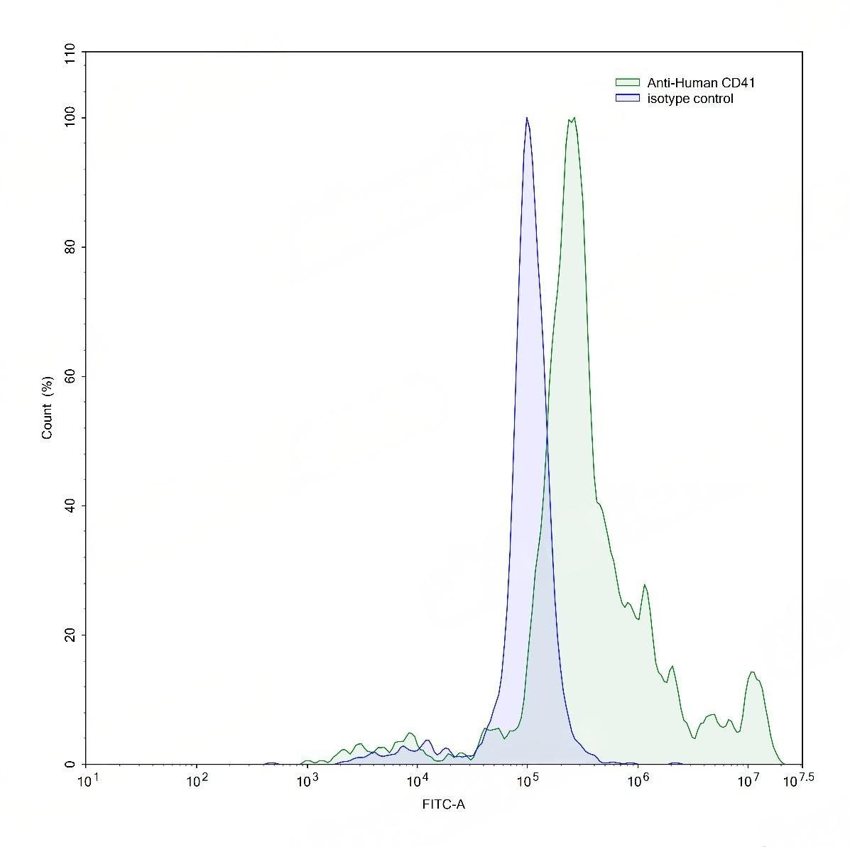 Flow-cytometry using anti-human CD41 antibody.Human peripheral blood monocytes were stained with an irrelevant antibody (Blue Histogram) or an anti-human CD41 antibody monoclonal antibody (Catalog # TD-HY355207 ,Green Histogram) at a concentration of 5 µg/ml for 30 mins at RT. After washing, bound antibody was detected using a FITC conjugated goat anti-mouse antibody (Catalog # TD-MF690414) and cells analysed on a NovoCyte Flow Cytometer.