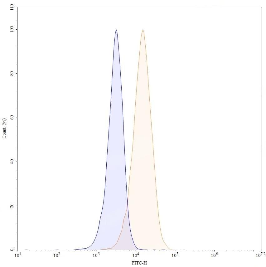 Flow-cytometry using FITC anti-human CD7 antibody. Jurkat cells were stained with an irrelevant antibody (Blue Histogram) or an FITC anti-human CD7 monoclonal antibody (Catalog No.:TD-HY302217, Yellow Histogram) at a concentration of 5 µg/ml for 30 mins at RT. After washing, cells analysed on a NovoCyte Flow Cytometer.