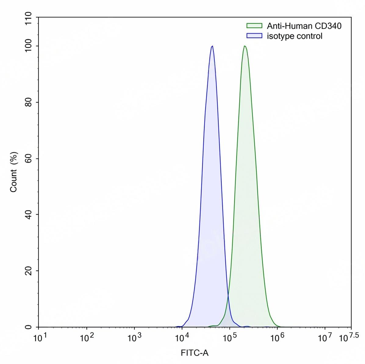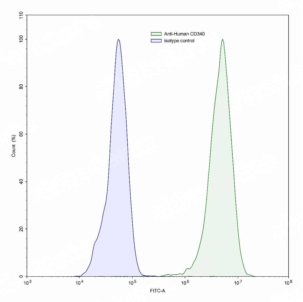 Flow-cytometry using anti-human CD340 antibody.SK-BR-3 cells were stained with an irrelevant antibody (Blue Histogram) or an anti-human CD340 antibody monoclonal antibody (Catalog:TD-HY286107 ,Green Histogram) at a concentration of 5 ug/ml for 30 mins at RT. After washing, bound antibody was detected using a FITC conjugated goat anti-human antibody (Catalog:TD-HF690414) and cells analysed on a NovoCyte Flow Cytometer.