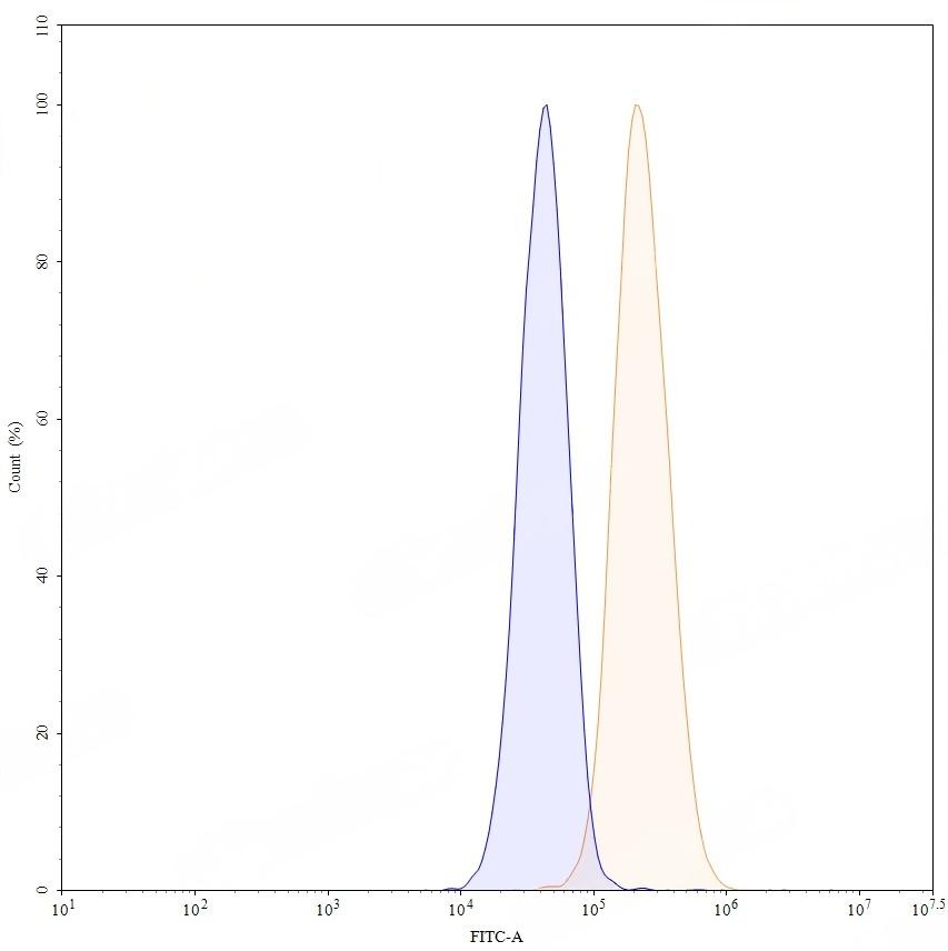 Flow-cytometry using anti-human CD340 antibody. MCF-7 cells were stained with an irrelevant antibody (Blue Histogram) or an anti-human CD340 monoclonal antibody (Catalog:TD-HY286107, Yellow Histogram) at a concentration of 5 µg/ml for 30 mins at RT. After washing, bound antibody was detected using a a Goat Anti-Human IgG H&L Polyclonal Antibody, FITC (Catalog:TD-HF690414) and cells analysed on a NovoCyte Flow Cytometer.