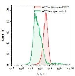 Flow-cytometry using APC anti-human CD20 antibody. Daudi cells were stained with an irrelevant antibody (Green Histogram) or an APC anti-human CD20 antibody monoclonal antibody (Catalog No.:TD-HY257137, Red Histogram) at a concentration of 5 µg/ml for 30 mins at RT. After washing, cells analysed on a NovoCyte Flow Cytometer.