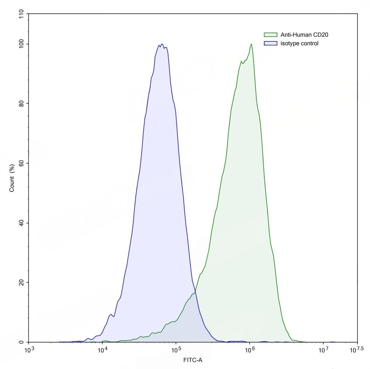 Flow-cytometry using anti-human CD20 antibody.Daudi cells were stained with an irrelevant antibody (Blue Histogram) or an anti-human CD20 antibody monoclonal antibody (Catalog No.:TD-HY257107 ,Green Histogram) at a concentration of 5 µg/ml for 30 mins at RT. After washing, bound antibody was detected using a FITC conjugated goat anti-mouse antibody (Catalog No.:TD-MF690414) and cells analysed on a NovoCyte Flow Cytometer.
