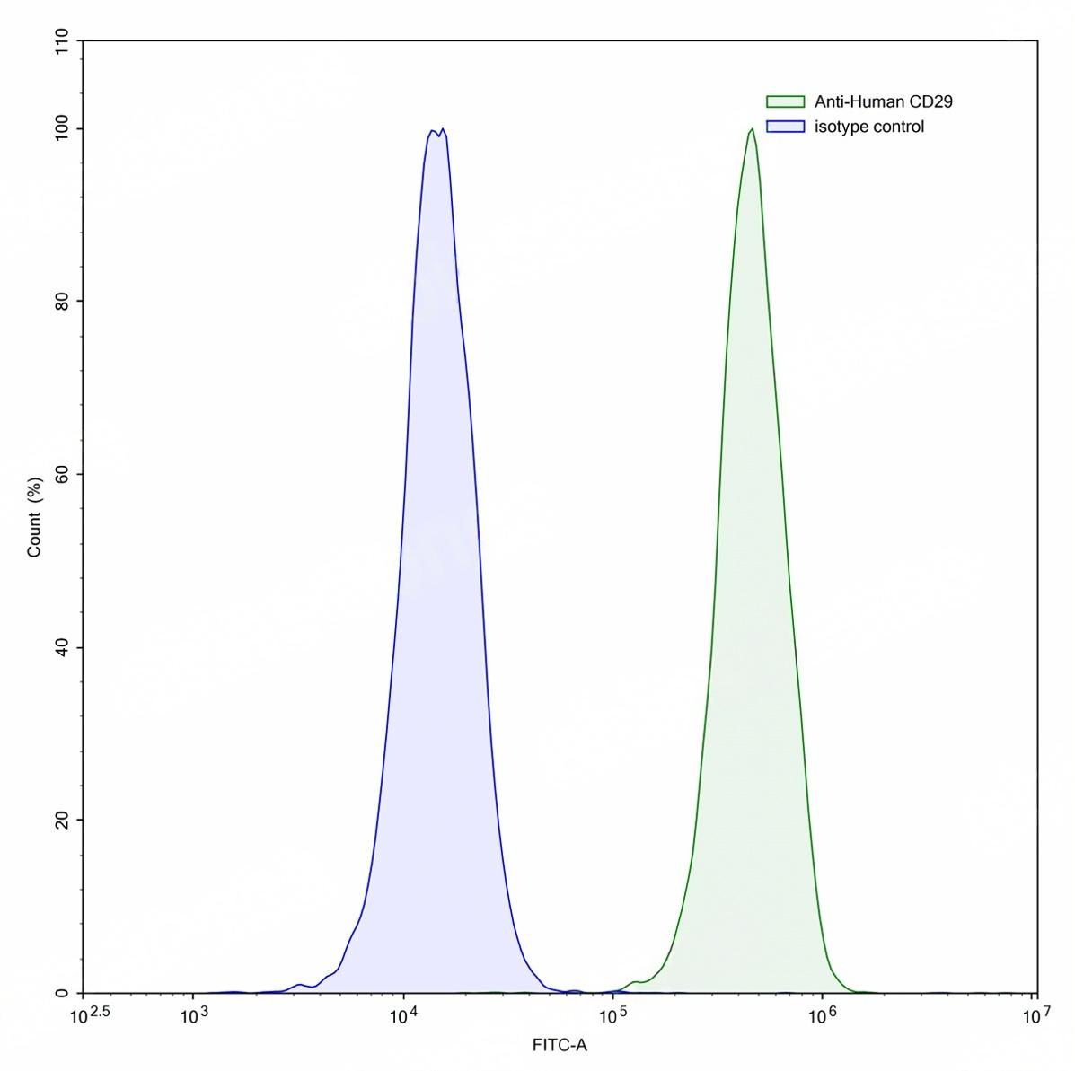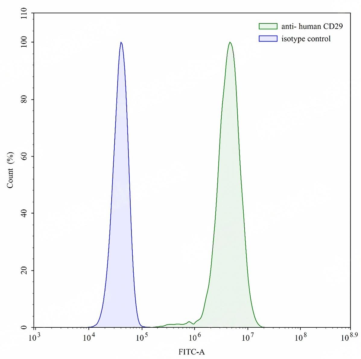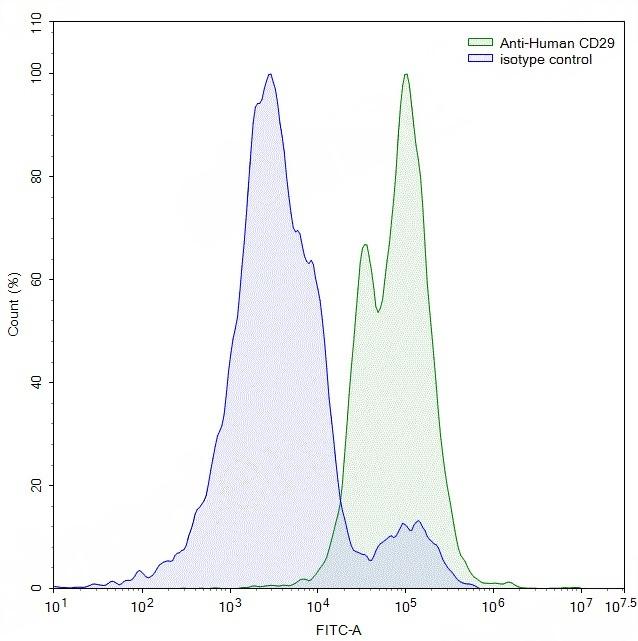 Flow-cytometry using anti-human CD29 antibody.MOLT-4 cells were stained with an irrelevant antibody (Blue Histogram) or an anti-human CD29 antibody monoclonal antibody (Catalog # TD-HY248207 ,Green Histogram) at a concentration of 5 ug/ml for 30 mins at RT. After washing, bound antibody was detected using a FITC conjugated goat anti-mouse antibody (Catalog # TD-MF690414) and cells analysed on a NovoCyte Flow Cytometer.