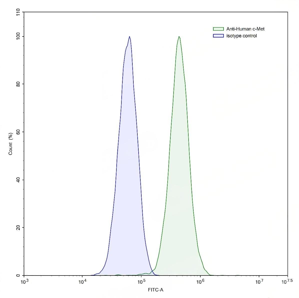 Flow-cytometry using anti-human c-Met antibody.HeLa cells were stained with an irrelevant antibody (Blue Histogram) or an anti-human c-Met antibody monoclonal antibody (Catalog No.:TD-HY196107 ,Green Histogram) at a concentration of 5 µg/ml for 30 mins at RT. After washing, bound antibody was detected using a FITC conjugated goat anti-human antibody (Catalog No.:TD-HF690414) and cells analysed on a NovoCyte Flow Cytometer. | Flow-cytometry using anti-human c-Met antibody.HepG2 cells were stained with an irrelevant antibody (Blue Histogram) or an anti-human c-Met antibody monoclonal antibody (Catalog No.:TD-HY196107 ,Green Histogram) at a concentration of 5 µg/ml for 30 mins at RT. After washing, bound antibody was detected using a FITC conjugated goat anti-human antibody (Catalog No.:TD-HF690414) and cells analysed on a NovoCyte Flow Cytometer. | Flow-cytometry using anti-human c-Met antibody.HT-29 cells were stained with an irrelevant antibody (Blue Histogram) or an anti-human c-Met antibody monoclonal antibody (Catalog No.:TD-HY196107 ,Green Histogram) at a concentration of 5 µg/ml for 30 mins at RT. After washing, bound antibody was detected using a FITC conjugated goat anti-human antibody (Catalog No.:TD-HF690414) and cells analysed on a NovoCyte Flow Cytometer.