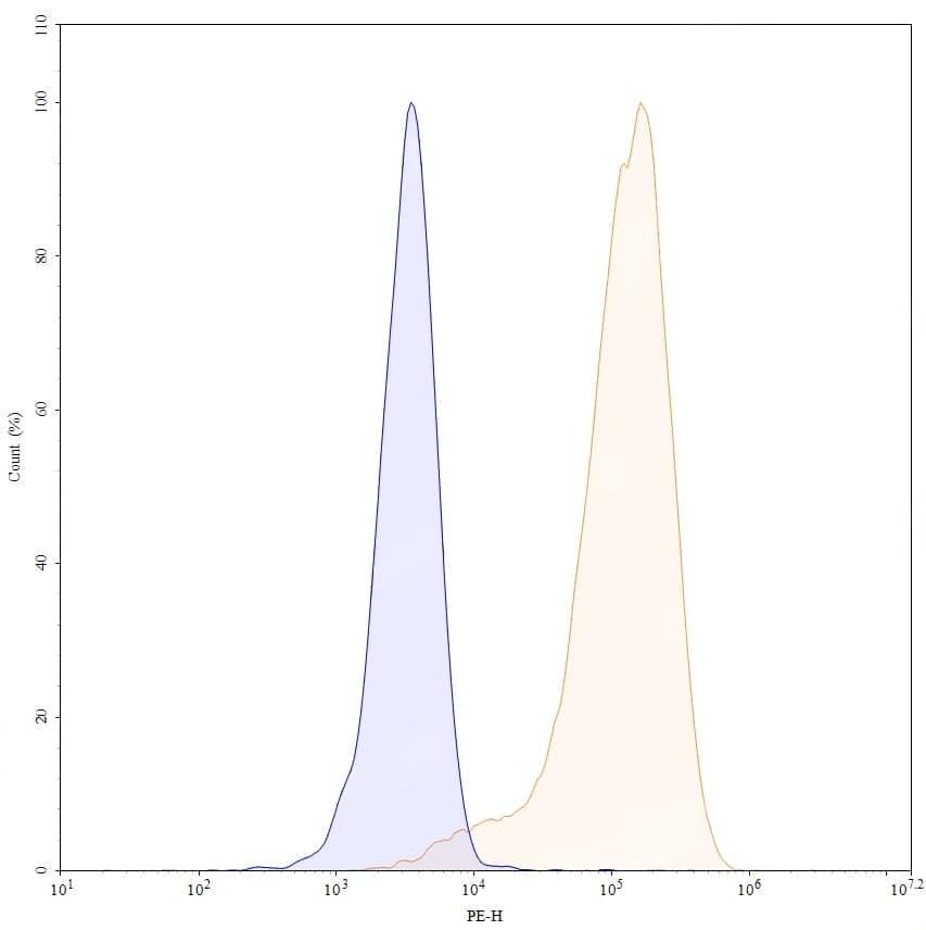 Flow-cytometry using PE anti-human CD117 antibody. HEL cells were stained with an irrelevant antibody (Blue Histogram) or an PE anti-human CD116 monoclonal antibody (Catalog No.:TD-HY163127, Yellow Histogram) at a concentration of 5 µg/ml for 30 mins at RT. After washing, and cells analysed on a NovoCyte Flow Cytometer.