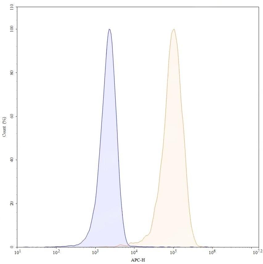 Flow-cytometry using APC anti-human CD2 antibody. Jurkat cells were stained with an irrelevant antibody (Blue Histogram) or an APC anti-human CD2 monoclonal antibody (Catalog No.:TD-HY113237, Yellow Histogram) at a concentration of 5 µg/ml for 30 mins at RT. After washing, and cells analysed on a NovoCyte Flow Cytometer.