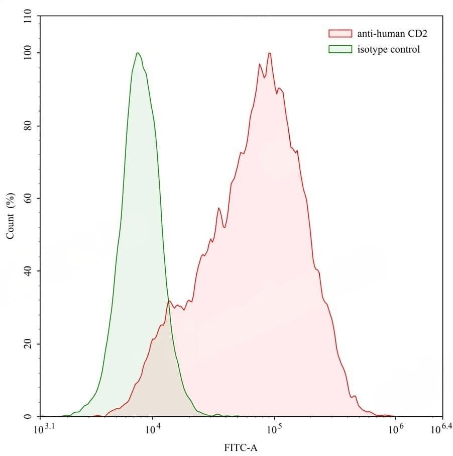 Detects CD2 in indirect ELISAs. | Flow-cytometry using anti-human CD2 antibody. Human Jurkat cell line were stained with an irrelevant antibody (Green Histogram) or an anti-human CD2 antibody monoclonal antibody (Catalog No.:TD-HY113107 , Red Histogram) at a concentration of 20 µg/ml for 30 mins at RT. After washing, bound antibody was detected using a CoraLite488 conjugated goat anti-mouse antibody (Catalog No.:TD-MF690314) and cells analysed on a NovoCyte Flow Cytometer. | Western blot analysis was performed using anti-CD2 monoclonal antibody at 1ug/mL on various samples.Lane 1:recombinant human CD2 (Catalog No.:TD-HY113011)Lane 2:negative control