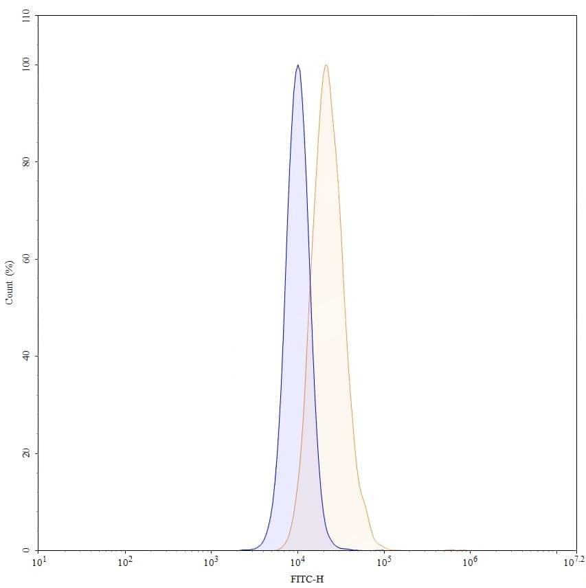 Flow-cytometry using FITC anti-human CD228 antibody. A431 cells were stained with an irrelevant antibody (Blue Histogram) or an FITC anti-human CD228 monoclonal antibody (Catalog No.:TD-HY094117, Yellow Histogram) at a concentration of 5 µg/ml for 30 mins at RT. After washing, and cells analysed on a NovoCyte Flow Cytometer.