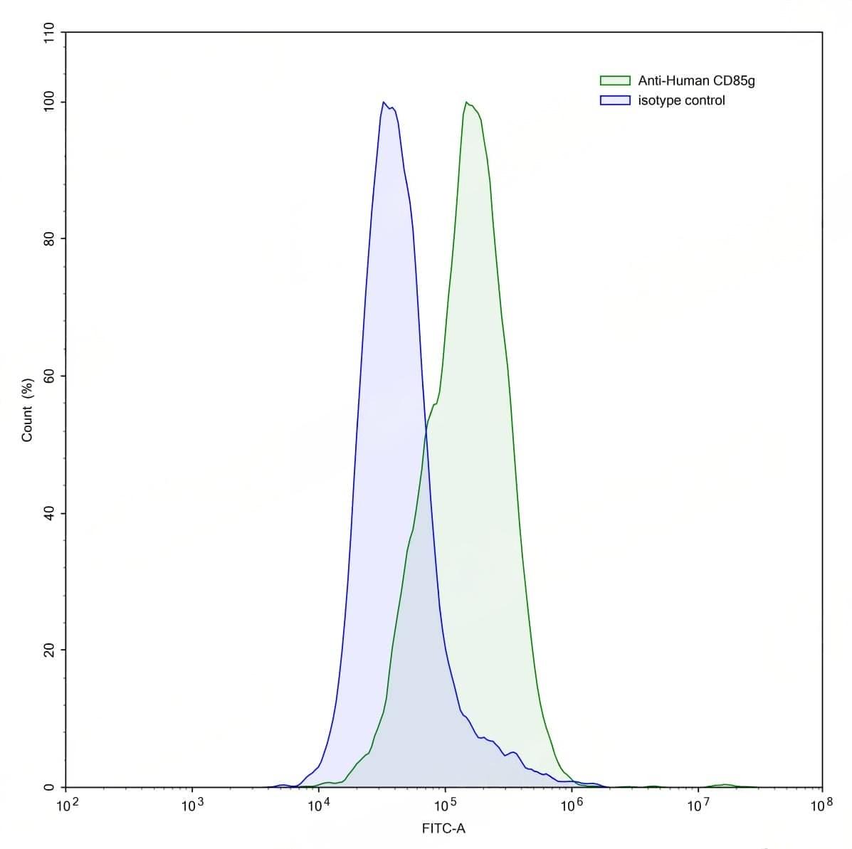 Flow-cytometry using anti-human CD85g antibody.CD85g Transfected CHO cells were stained with an irrelevant antibody (Blue Histogram) or an anti-human CD85g antibody monoclonal antibody (Catalog No.:TD-HX894107 ,Green Histogram) at a concentration of 5 µg/ml for 30 mins at RT. After washing, bound antibody was detected using a FITC conjugated goat anti-human antibody (Catalog No.:TD-HF690414) and cells analysed on a NovoCyte Flow Cytometer.