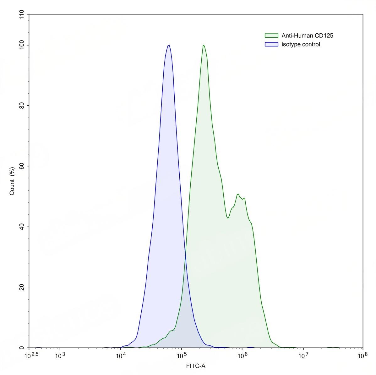 Flow-cytometry using anti-human CD125 antibody.CD125 Transfected CHO cells were stained with an irrelevant antibody (Blue Histogram) or an anti-human CD125 antibody monoclonal antibody (Catalog # TD-HX243107 ,Green Histogram) at a concentration of 5 µg/ml for 30 mins at RT. After washing, bound antibody was detected using a FITC conjugated goat anti-mouse antibody (Catalog # TD-MF690414) and cells analysed on a NovoCyte Flow Cytometer.