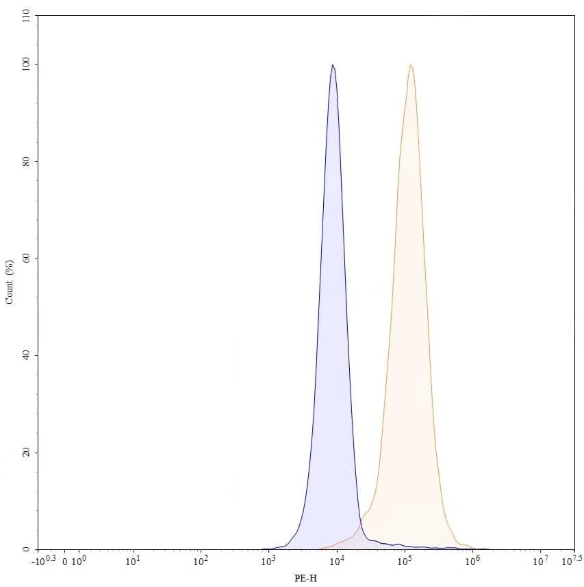 Flow-cytometry using PE anti-human CD49a antibody. Hela cells were stained with an irrelevant antibody (Blue Histogram) or an PE anti-human CD49a monoclonal antibody (Catalog No.:TD-HX227127, Yellow Histogram) at a concentration of 5 µg/ml for 30 mins at RT. After washing, and cells analysed on a NovoCyte Flow Cytometer.