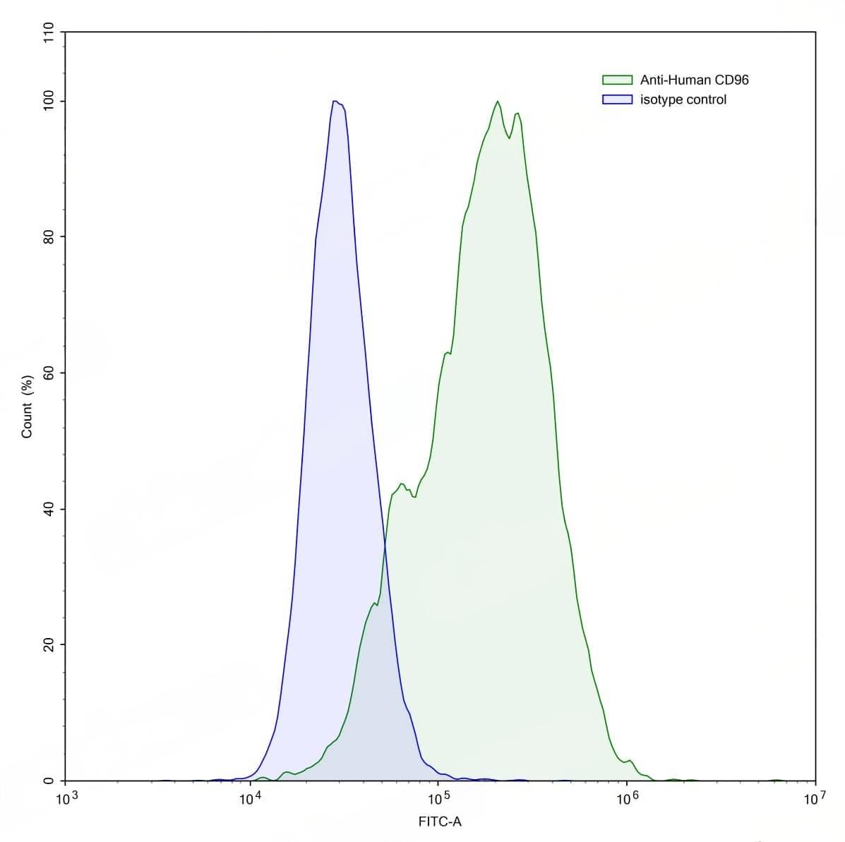 Flow-cytometry using anti-human CD96 antibody.CD96 Transfected CHO cells were stained with an irrelevant antibody (Blue Histogram) or an anti-human CD96 antibody monoclonal antibody (Catalog No.:TD-HW832207 ,Green Histogram) at a concentration of 5 µg/ml for 30 mins at RT. After washing, bound antibody was detected using a FITC conjugated goat anti-mouse antibody (Catalog No.:TD-MF690414) and cells analysed on a NovoCyte Flow Cytometer.