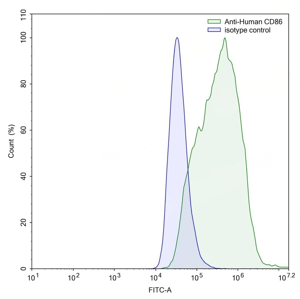 Detects Human CD86/B7-2 in indirect ELISAs. | Flow-cytometry using anti-human CD86 antibody.Daudi cells were stained with an irrelevant antibody (Blue Histogram) or an anti-human CD86 antibody monoclonal antibody (Catalog No.:TD-HW776207 ,Green Histogram) at a concentration of 5 µg/ml for 30 mins at RT. After washing, bound antibody was detected using a FITC conjugated goat anti-mouse antibody (Catalog No.:TD-MF690414) and cells analysed on a NovoCyte Flow Cytometer. | Flow-cytometry using anti-human CD86 antibody.K562 cells were stained with an irrelevant antibody (Blue Histogram) or an anti-human CD86 antibody monoclonal antibody (Catalog No.:TD-HW776207 ,Green Histogram) at a concentration of 5 µg/ml for 30 mins at RT. After washing, bound antibody was detected using a FITC conjugated goat anti-mouse antibody (Catalog No.:TD-MF690414) and cells analysed on a NovoCyte Flow Cytometer.