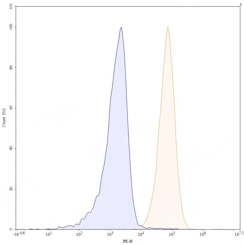 Flow-cytometry using PE anti-human CD70 antibody. Raji cells were stained with an irrelevant antibody (Blue Histogram) or an PE anti-human CD70 monoclonal antibody (Catalog No.:TD-HW717227, Yellow Histogram) at a concentration of 5 µg/ml for 30 mins at RT. After washing, and cells analysed on a NovoCyte Flow Cytometer.