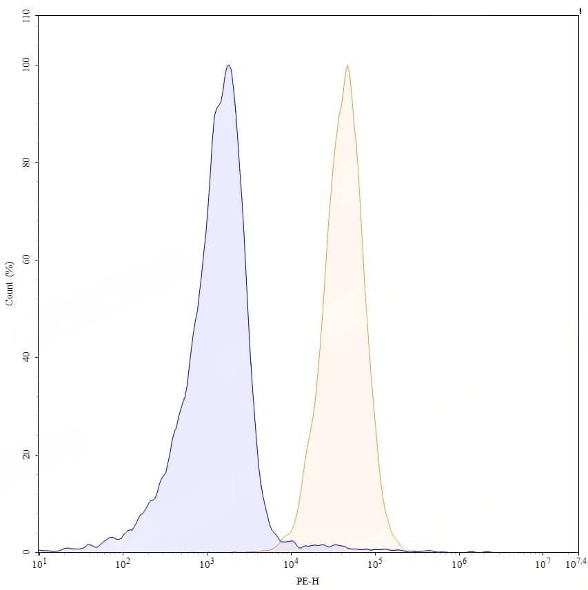 Flow-cytometry using PE anti-human CD70 antibody. Raji cells were stained with an irrelevant antibody (Blue Histogram) or an PE anti-human CD70 monoclonal antibody (Catalog No.:TD-HW717127, Yellow Histogram) at a concentration of 5 µg/ml for 30 mins at RT. After washing, and cells analysed on a NovoCyte Flow Cytometer.
