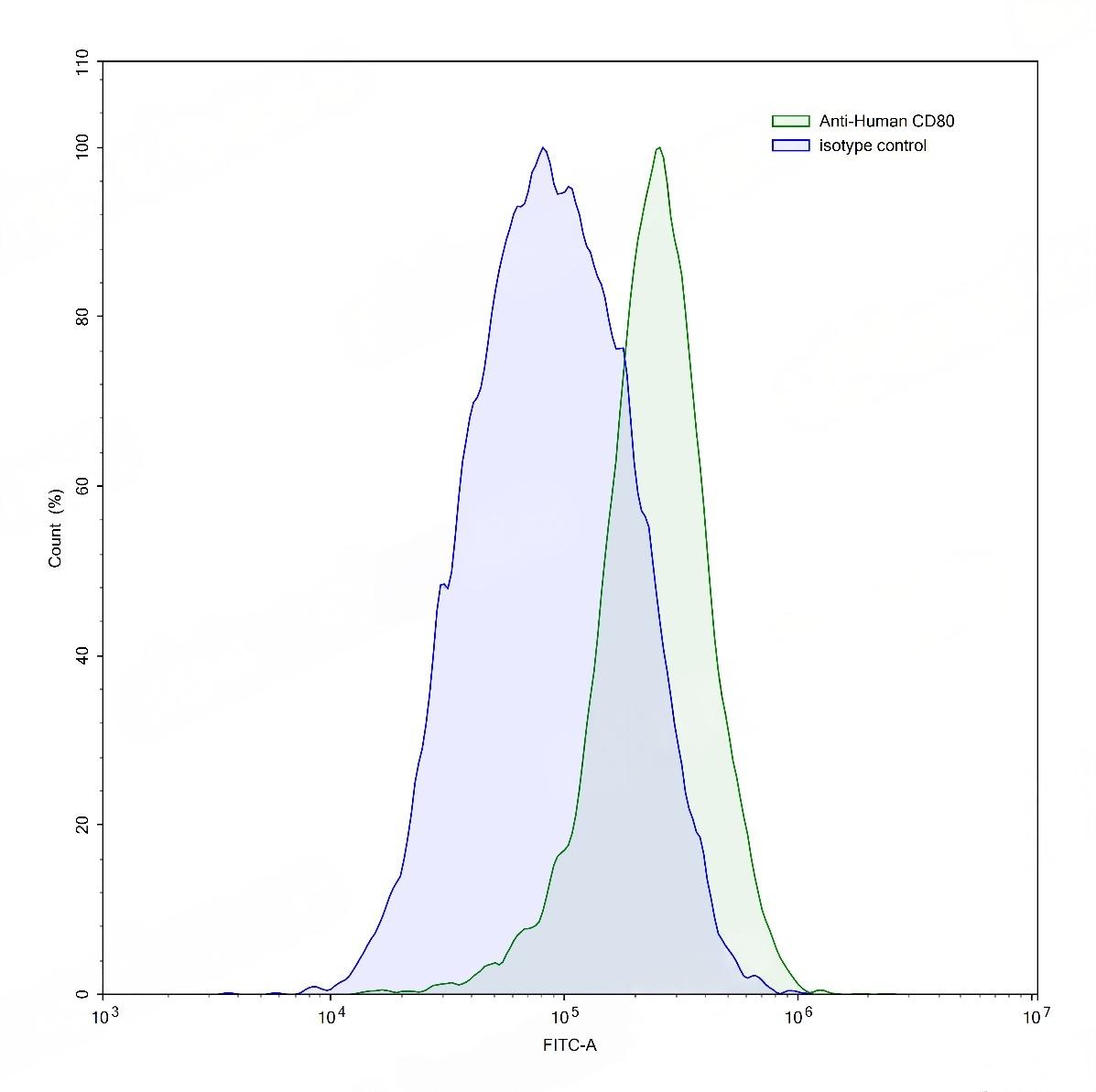 Flow-cytometry using anti-human CD80 antibody.Raji cells were stained with an irrelevant antibody (Blue Histogram) or an anti-human CD80 antibody monoclonal antibody (Catalog # TD-HW630107 ,Green Histogram) at a concentration of 5 µg/ml for 30 mins at RT. After washing, bound antibody was detected using a FITC conjugated goat anti-mouse antibody (Catalog # TD-MF690414) and cells analysed on a NovoCyte Flow Cytometer.