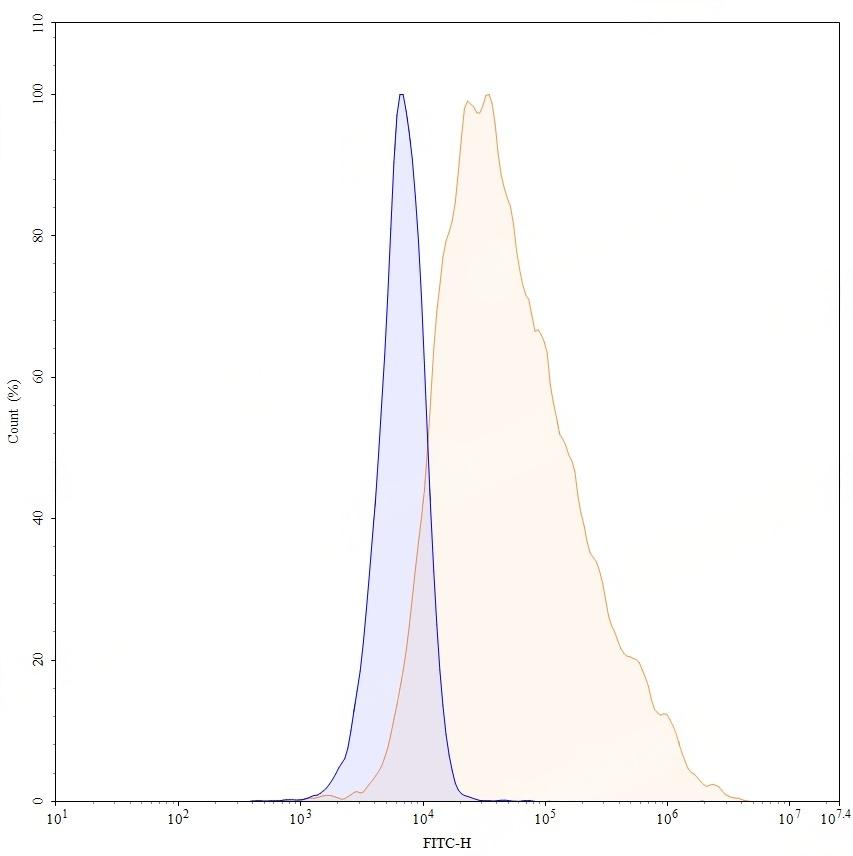 Flow-cytometry using anti-human CD193 antibody. Untransfected cells (blue Histogram) and Transfected cells (Yellow Histogram) were stained with an anti-human CD193 monoclonal antibody (Catalog: TD-HW620107) at a concentration of 5 µg/ml for 30 mins at RT. After washing, bound antibody was detected using a Goat Anti-Mouse IgG H&L Polyclonal Antibody, FITC (Catalog: TD-MF690414) and cells analysed on a NovoCyte Flow Cytometer.